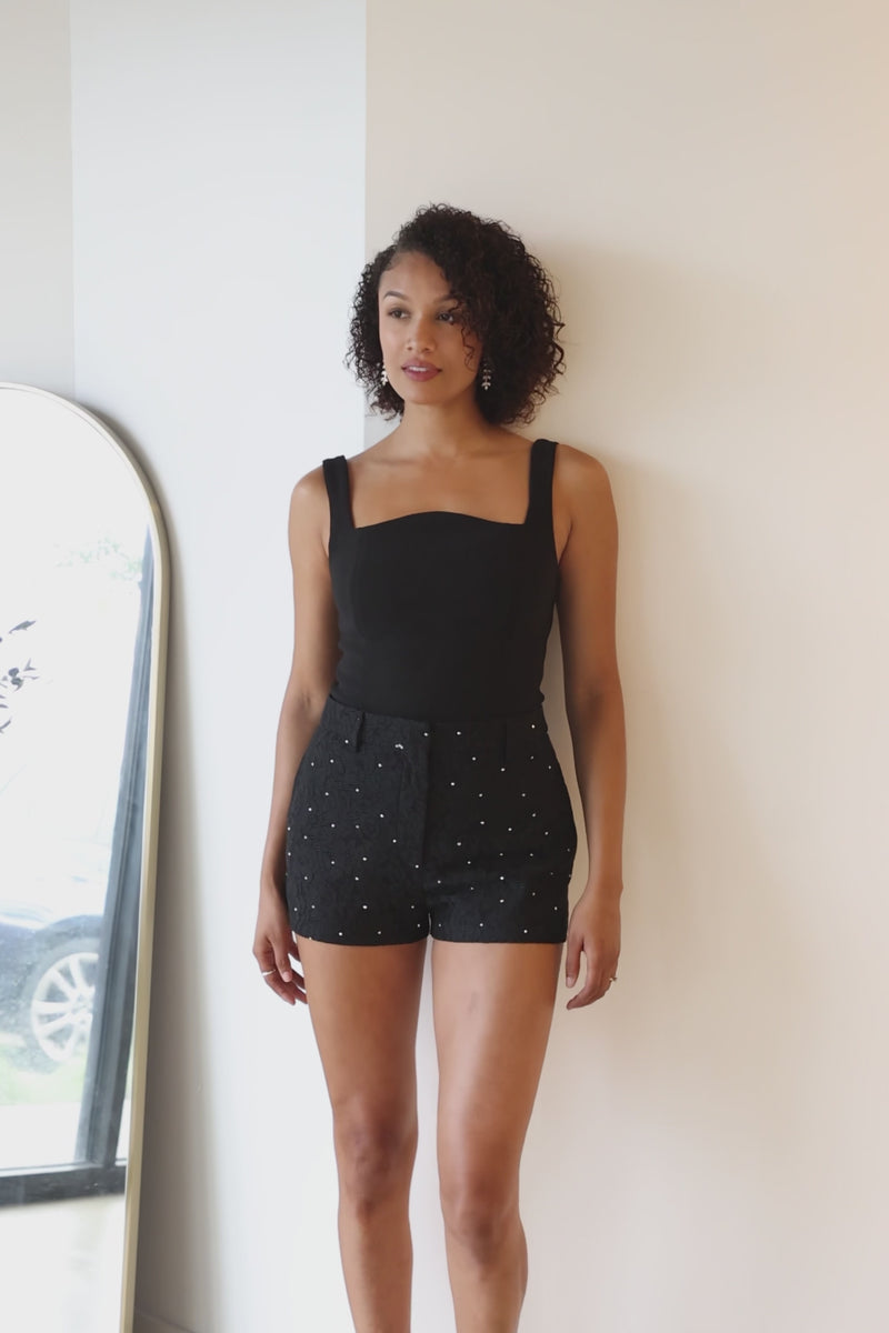 The Wynn Shorts by ASTR The Label are your new go-to for nights that call for a little extra sparkle. These structured, black lace mini shorts feature all-over hot-fixed rhinestones for a glam, glitzy finish that catches the light with every step. Designed with a flattering fit and functional details like belt loops, side pockets, faux back welt pockets, and a concealed front zipper, these fully lined shorts are as practical as they are party-ready. Pair them with a sleek black bodysuit, satin blouse, or even a cozy knit for a chic contrast of textures. Perfect for holiday parties, night outs, or festive dinners, these embellished mini shorts are the ideal mix of sultry and sophisticated, guaranteed to make a statement.