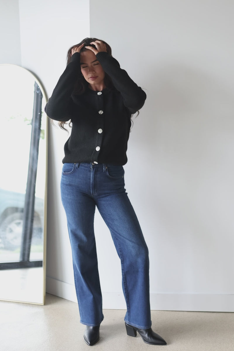 Bring a little sparkle to every outfit with the Maggie Cardigan by Show Me Your Mumu, a gorgeous soft black knit elevated by dazzling rhinestone button details. This classic button up silhouette gets a glam twist with jeweled accents that instantly dress up your look without ever feeling over the top. Style it with the Ziggy Shorts for the ultimate holiday glam moment, pair it with denim for a subtly polished everyday outfit, or layer it over a slip dress for an effortlessly chic evening vibe. A versatile piece that shines wherever you take it.