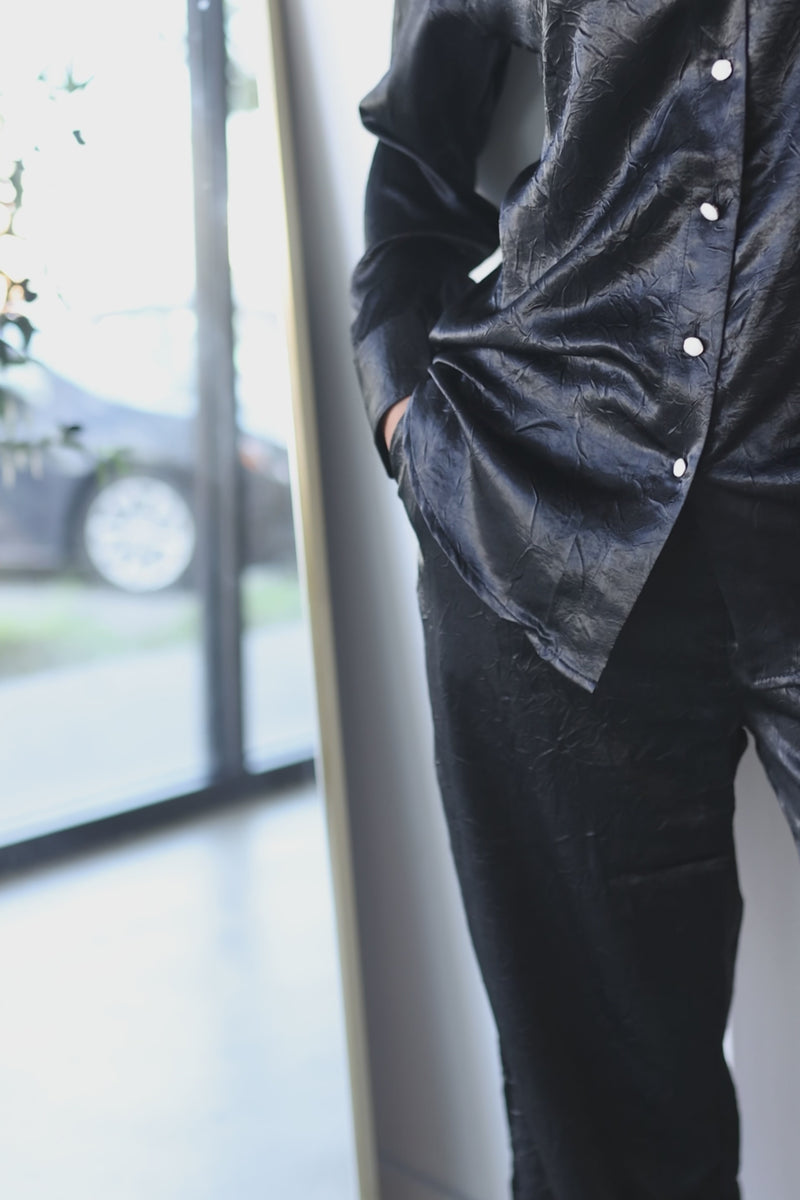 Fabric: Lightweight Crinkle Satin Material. Full Length Wide Leg Pant. Elastic Waistband with Adjustable Drawstring. Side Seam Pockets. Relaxed, Flowy Feel.