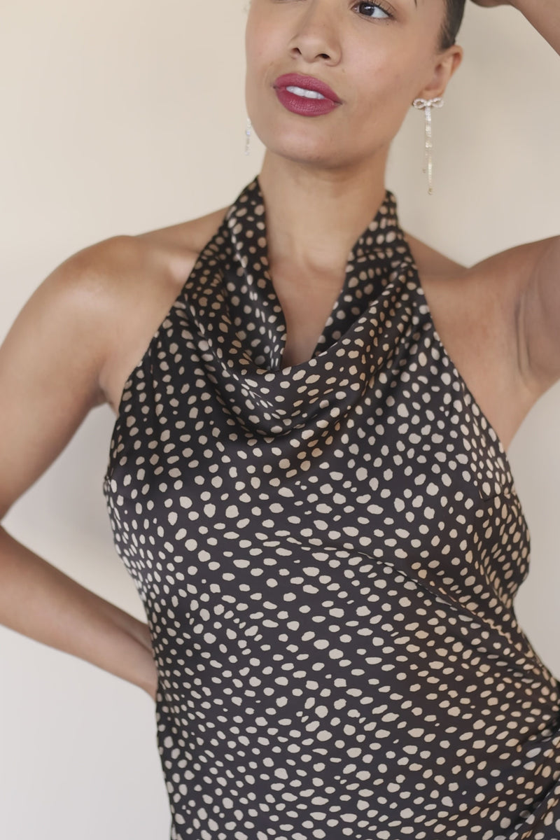 Fabric: Small Polka Dot Printed Sheen Lightweight Satin. Midi Length Dress. Halter Neckline with Cowl Drape and Double Button Closure at Nape of Neck. Open Back Design. Ruching at Sides. Exaggerated High Side Slit.