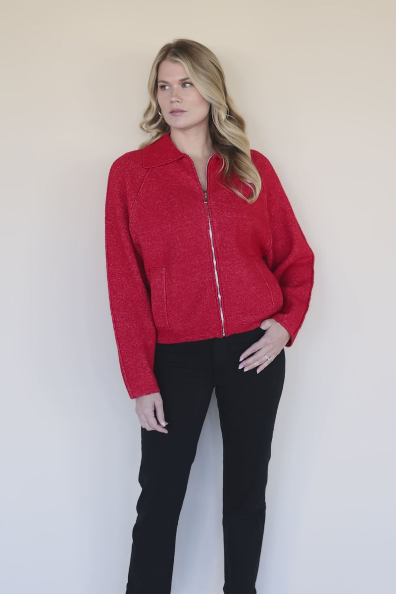 atThe Alexandra Zip Up Sweater by Velvet Heart is a cozy classic with a modern twist. This long sleeve sweater jacket features long raglan sleeves, a spread collar, and a full front zipper for that easy, throw on and go feel. Crafted from a soft, mid weight felt-like fabric, it offers a relaxed shape with a warm, textured finish. Front pockets and exposed seams add subtle detail that elevates the look. Available in two timeless shades, rich red and deep dark olive, this sweater jacket is perfect for everyday layering and effortless seasonal style!