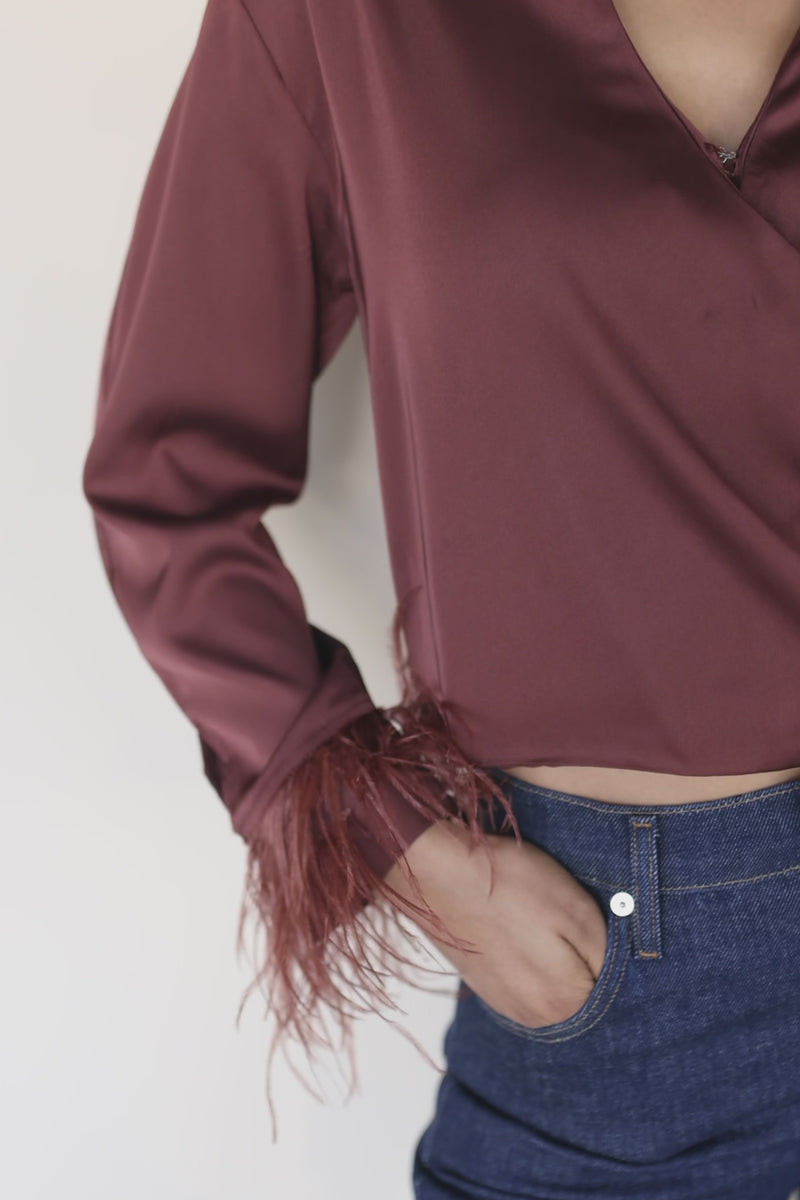 Fabric: Silky Satin with Feather Contrast Trim. Long Sleeve Blouse. Plunging V Neckline. Faux Wrap Detail. Slightly Cropped Silhouette. Pleating at Left Side for Draped Look. Hook & Eye closure at Bust.