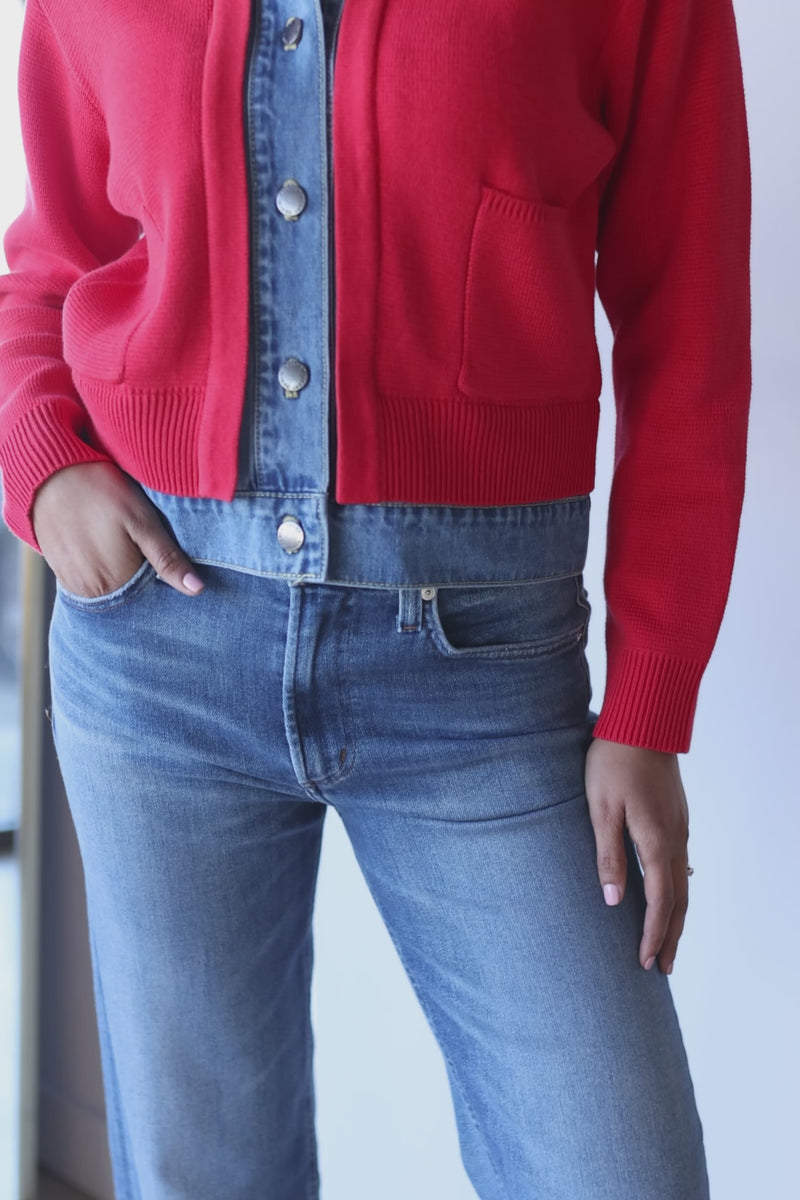 Fabric: Mixed Media Soft Knit Material Layered Over Cotton Denim. Long Sleeve Sweater Jacket Design. Button Up Front Closure. Collared Neckline. Front Patch Pockets.