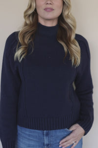 Meet your new wear with everything knit, The Goodwin Sweater by Velvet Heart. Her features include a classic mock neck, slightly cropped fit, and long sleeves with subtle reverse seam detailing for that effortless, modern touch. Crafted in a versatile navy hue, it’s the perfect piece to dress up or keep casual all season long. Style it with high waisted denim and sneakers for an easy everyday outfit, or pair it with a satin midi skirt and boots for a polished, cozy chic look. Layer it under a tailored coat for work days, throw it on with lounge pants for travel, or dress it up with statement earrings for dinner out.