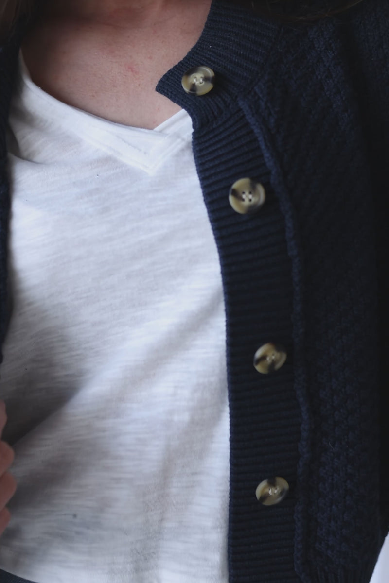 Introducing the Lila Cardi by Free People, a must-have for any wardrobe. Cut in a classic navy blue and made with textured knit material, this relaxed fitting cardigan features a slouchy style, button front closure, and ribbed details. With dropped shoulders and defined seaming, it adds dimension to any look. Perfect to wear open over a tank or as a stand-alone piece with your favorite denim. Effortlessly transition from summer to fall with this versatile cardigan!