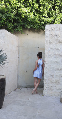 Fabric: Lightweight Luxe Satin Material. Mini Length Dress. Mock Neck Halter Neckline with Adjustable Scarf Tie. Dramatic Open Back. Slip Inspired Silhouette. Fully Lined.