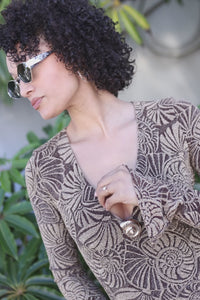 Experience the feel of ultimate luxury with our Lopez Dress by Show Me Your Mumu! This stunning maxi dress features a gorgeous gold metallic palm print against a brown backdrop, with a plunging v neckline and long sleeves. The seashell brooch detail at the neckline adds a touch of elegance. This fitted dress is stretchy and comfortable, perfect for a resort-ready dinner on vacation or poolside drinks with your girls. Don't miss out on this elevated and glamorous look!