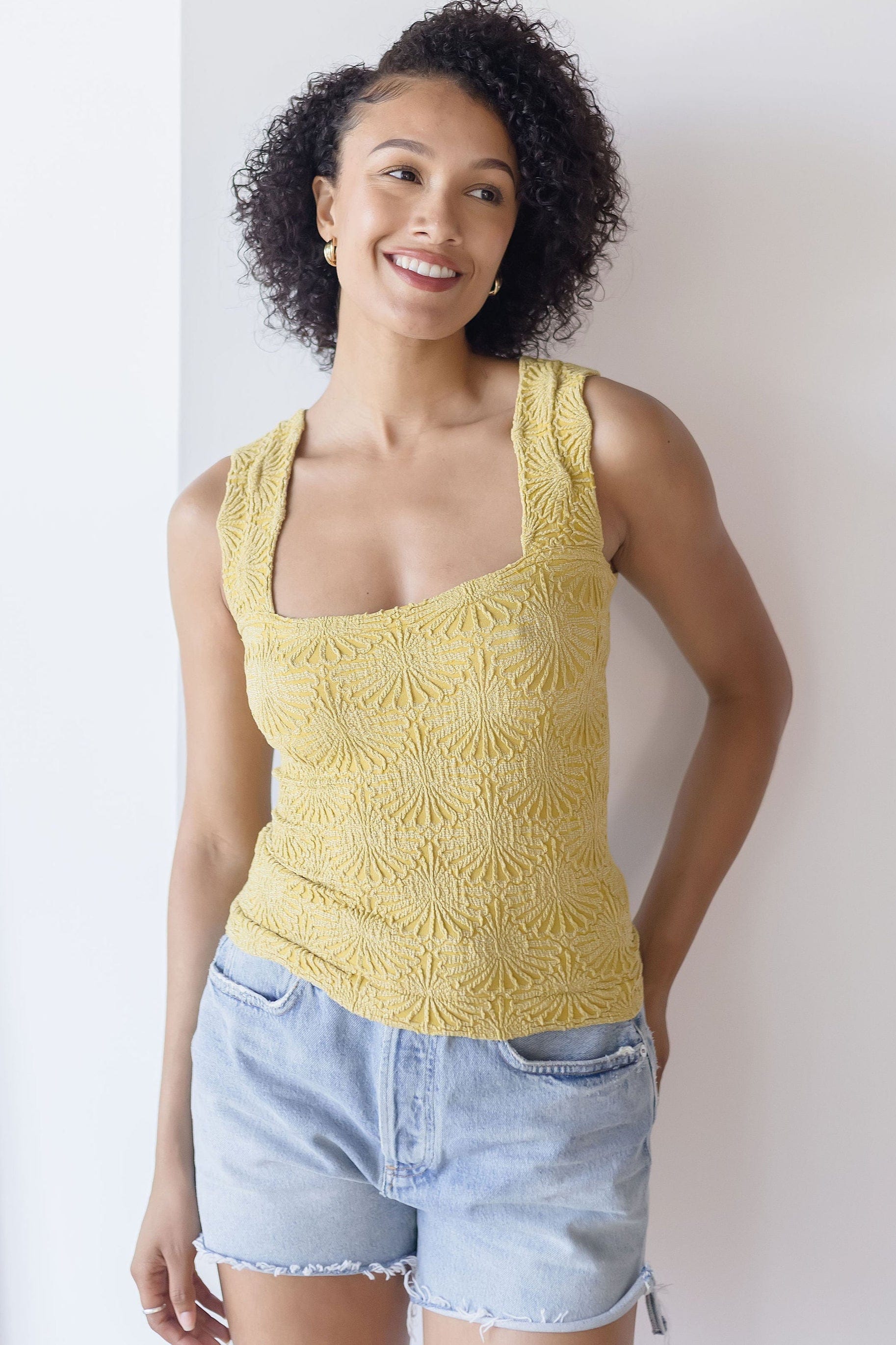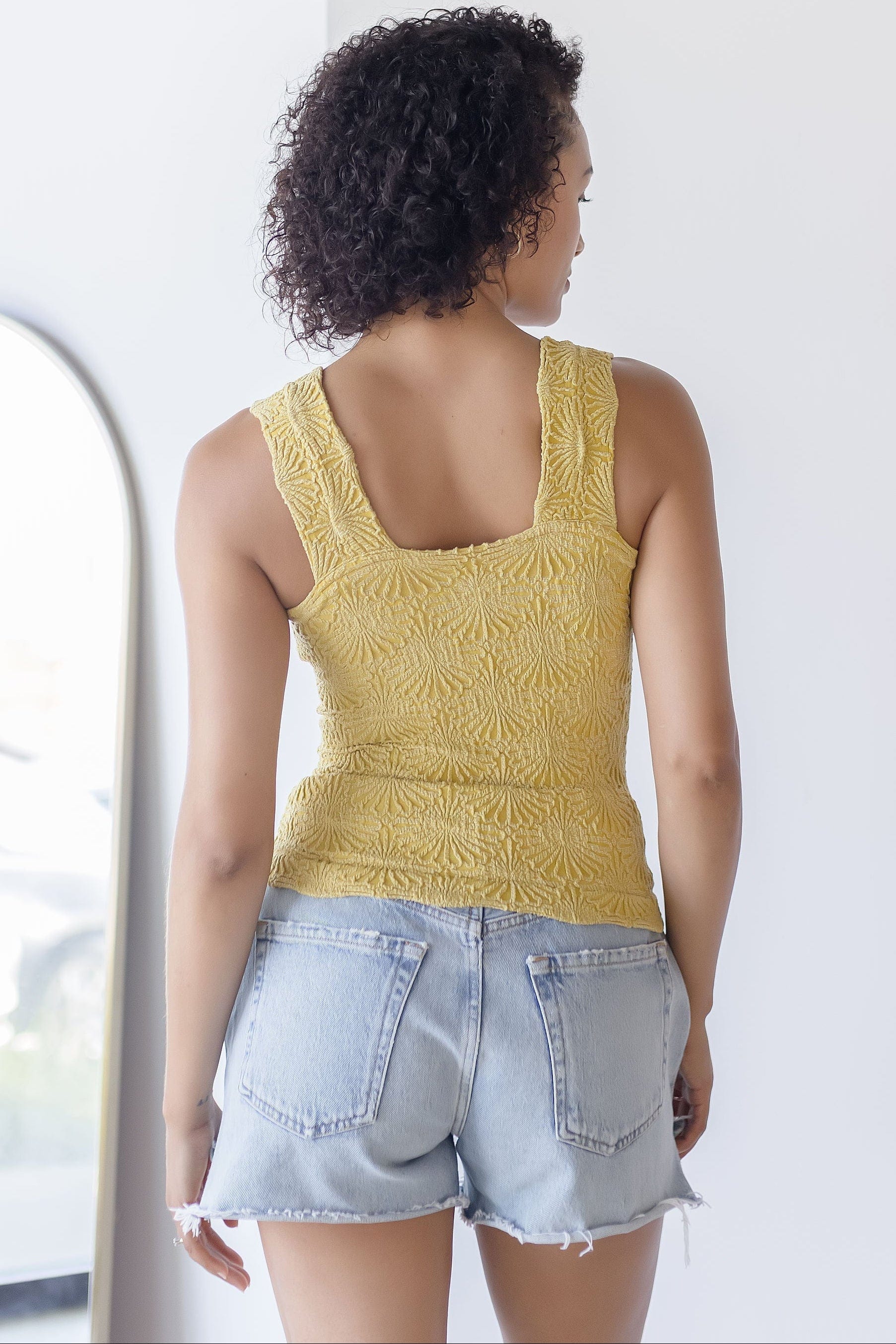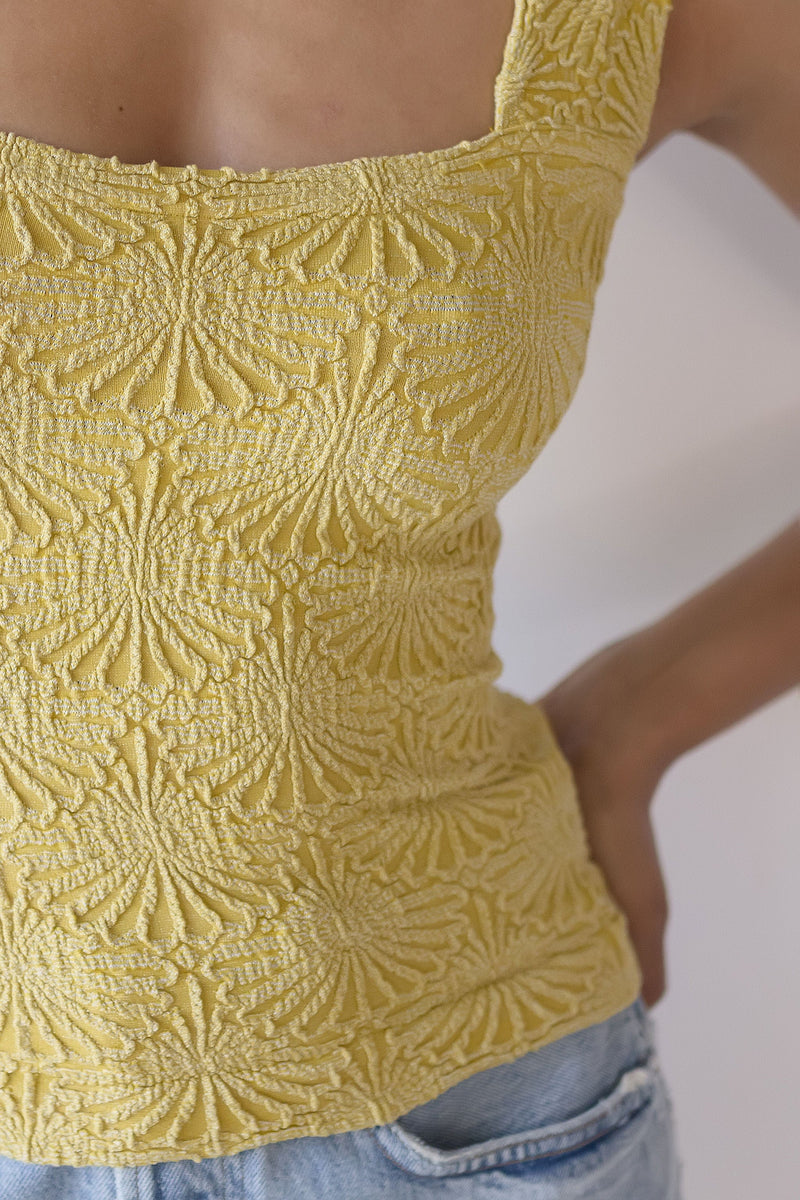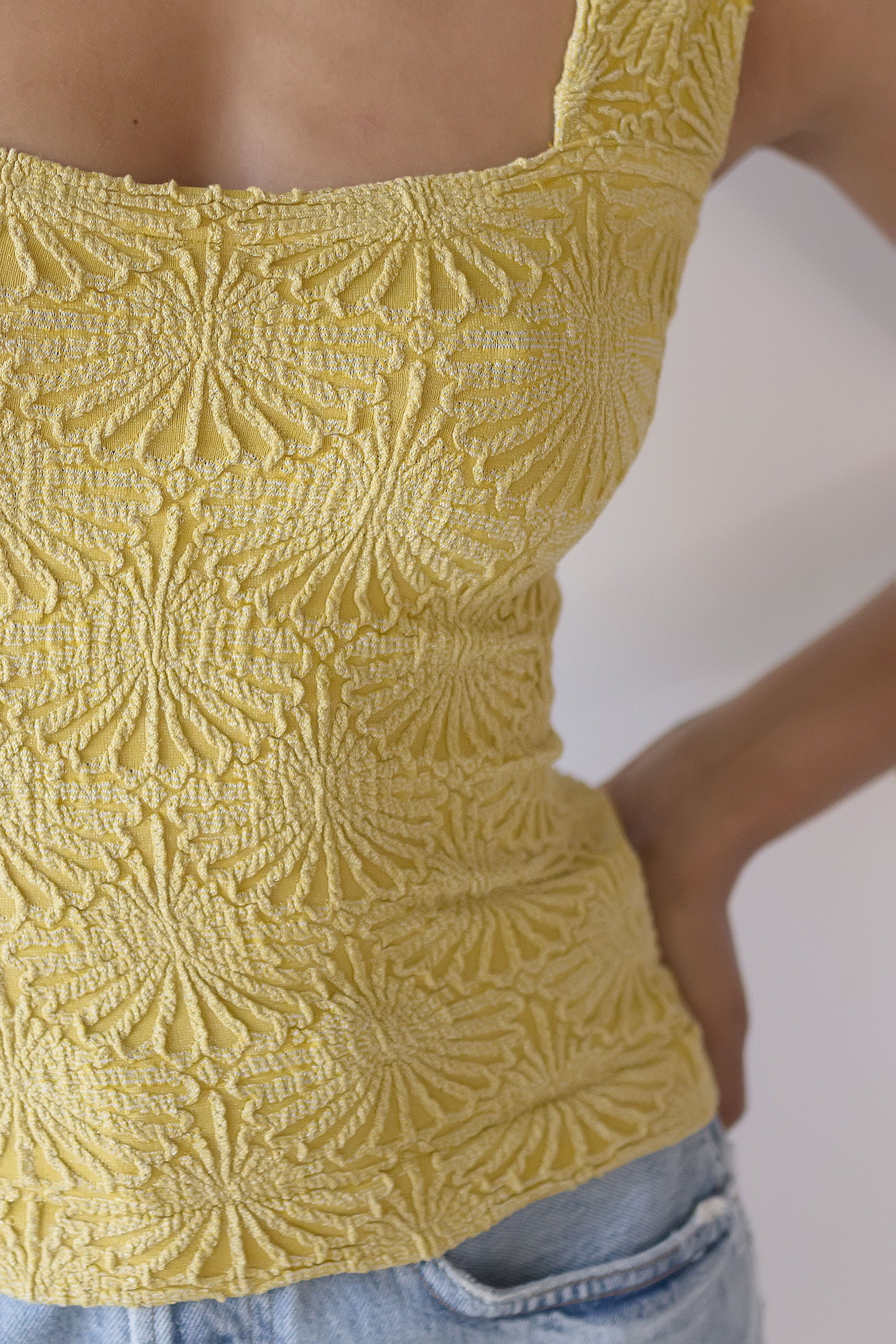 Fabric: Soft and Stretchy Textured Material. Pull-on design. Stretch fit. Wide straps. Cropped. Square Neckline. Jacquard Floral Design. Lettuce-edge Hem.