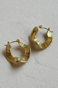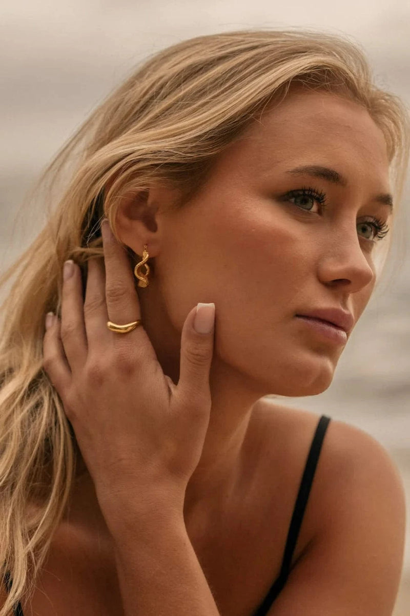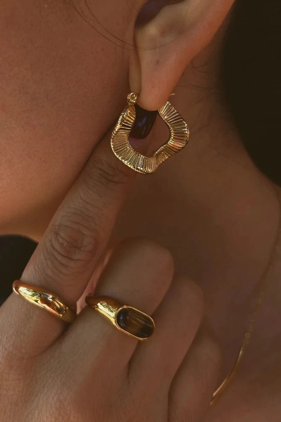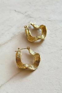 Small in size, big in style — the Lyra Hoops by Boem Collection bring a bold twist to a classic silhouette. With their sculptural wave design and retro-inspired vibe, these textured beauties instantly elevate any look. Crafted in 18K gold-plated stainless steel for tarnish-resistant shine, they're perfect for everyday wear, travel, or dressing up on the go. A little hoop with a lot of personality!