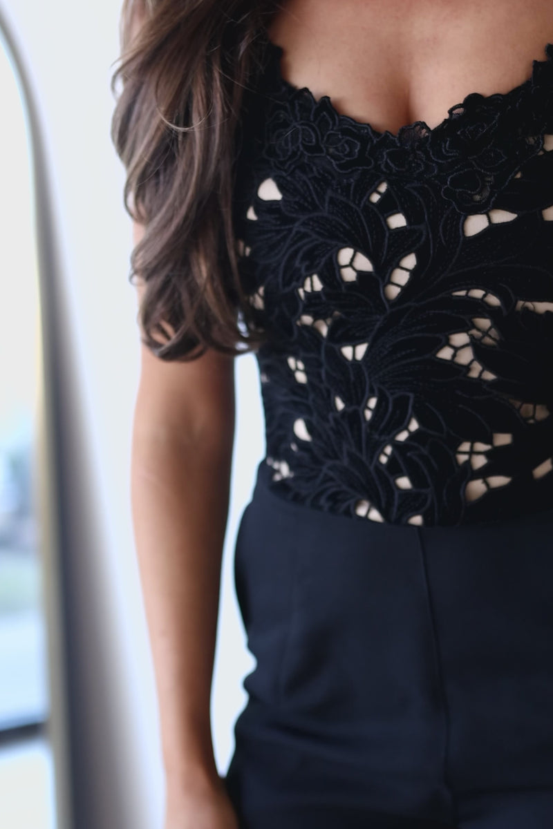 Make an unforgettable entrance in the Mykonos Jumpsuit by Heartloom, a stunning black one-piece that radiates sophistication and sultry charm. Designed with a sleek suiting material and a delicate lace panel at the bust, this full-length wide-leg jumpsuit combines timeless elegance with modern allure. The adjustable spaghetti straps and smocked back ensure a flattering, comfortable fit, while front pleating and side pockets add subtle structure and function. Perfect for holiday parties, dressy occasions, or romantic date nights, the Mykonos Jumpsuit is your ultimate go-to for a look that’s effortlessly chic and undeniably confident. Pair it with strappy heels, a bold red lip, and statement earrings for a head-turning finish that’s as polished as it is powerful.