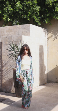 Fabric: Tropical Inspired Printed Silky Satin. Long Sleeve Top and Pant Pajama Set. Collared Long Sleeve Button Down Top. Elasticated Waistband Wide Leg Pant with Adjustable Waist Tie and Pockets.