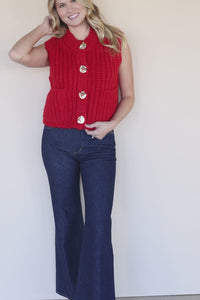 The Savoya Vest by Velvet Heart adds a bold pop of color and cozy texture to any winter wardrobe. Designed in a bright holiday red, this chunky knit vest offers a substantial, soft hand feel with charming details throughout. It features a round neckline, full front button up closure with standout gold novelty buttons, and ribbed armholes and hem for a clean, structured finish. Front patch pockets add both warmth and function, making it as practical as it is stylish. Pair it over a crisp white blouse for a festive, polished look, layer it with a turtleneck and denim for casual days, or style it with a black skirt and boots for a holiday ready moment!