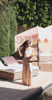 The Sun Kissed Wide Leg Pant by WREN The Label brings effortless tropical vibes to your vacation wardrobe. Crafted from lightweight luxe satin in a soft peach, pink, and green tropical print featuring palm trees and exotic birds, these pull on pants feel breezy, soft, and oh-so comfortable. Designed with a high waisted fit, smocked waistband with adjustable drawstring, wide legs, and convenient side pockets, they’re perfect for relaxed days or dressed up evenings. Pair with a simple tank, crop top, or your favorite resort blouse for an easy, sun-soaked look!