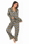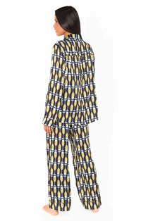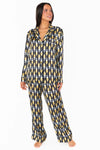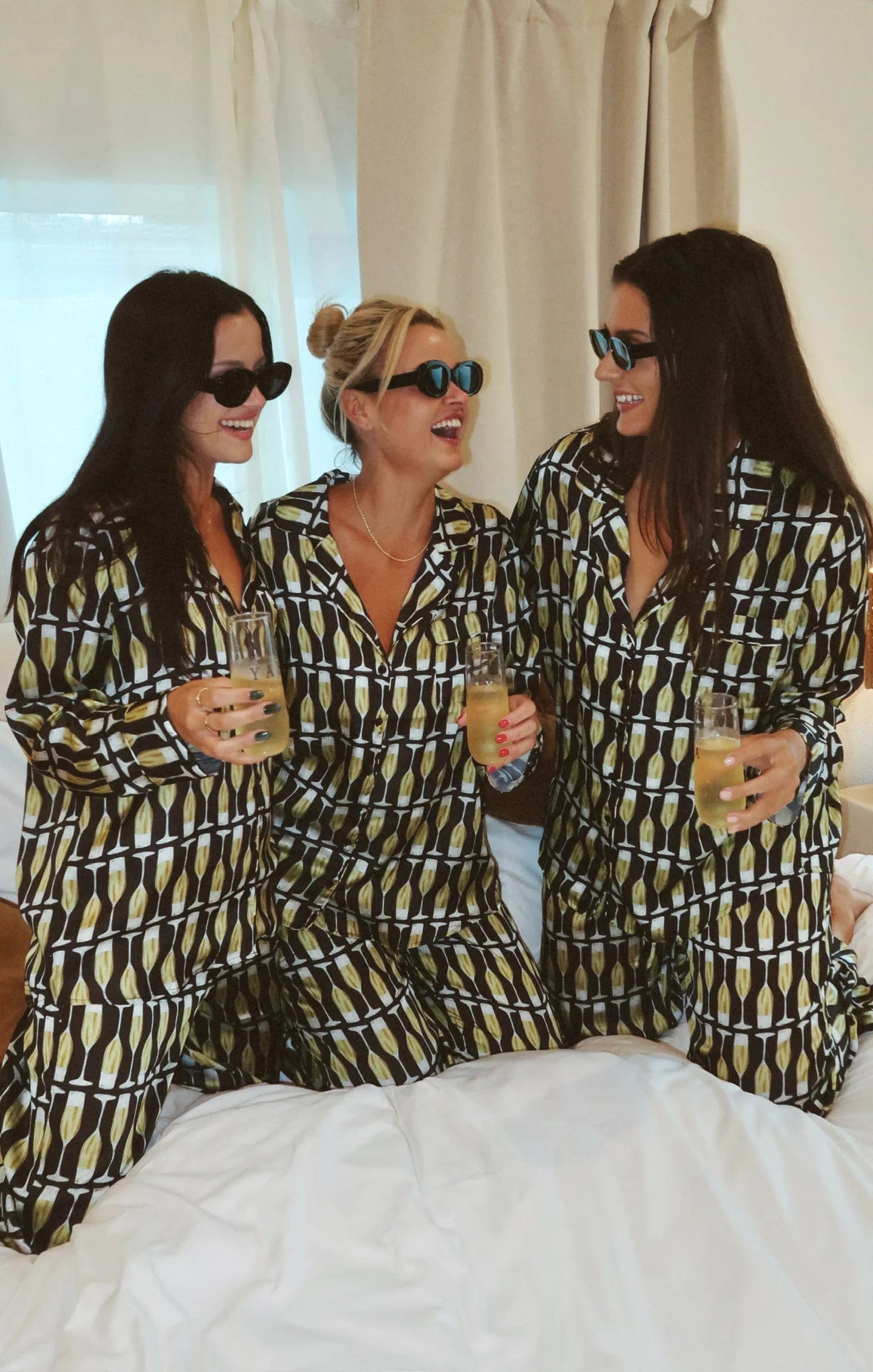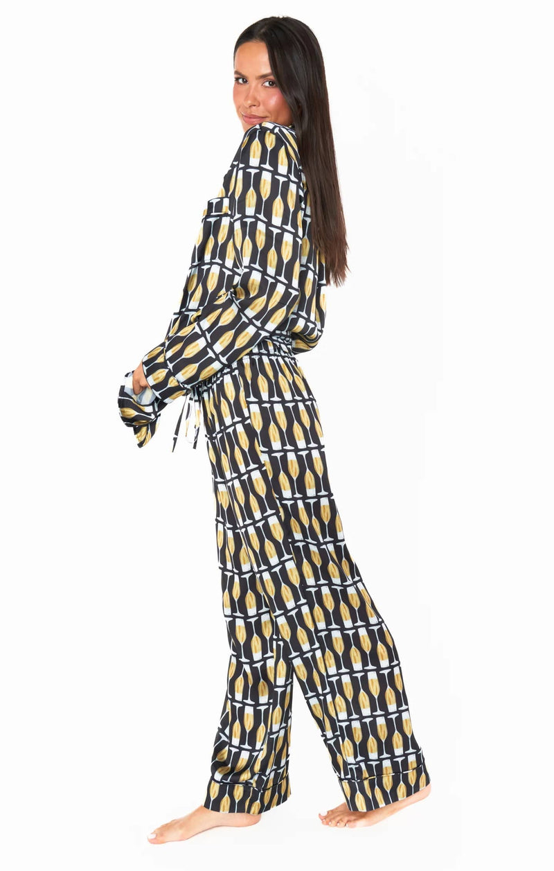 Champagne dreams in the Classic PJ Set by Show Me your Mumu. The top buttons down the front and the bottoms feature an elastic waistband with a tie.