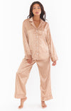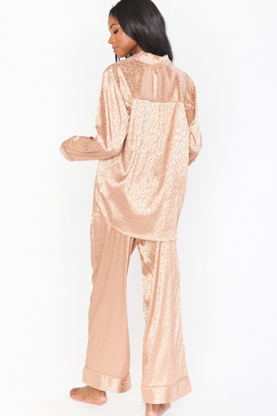 Gold cheetah dreams in the Classic PJ Set by Show Me your Mumu. The top buttons down the front and the bottoms feature an elastic waistband with a tie.