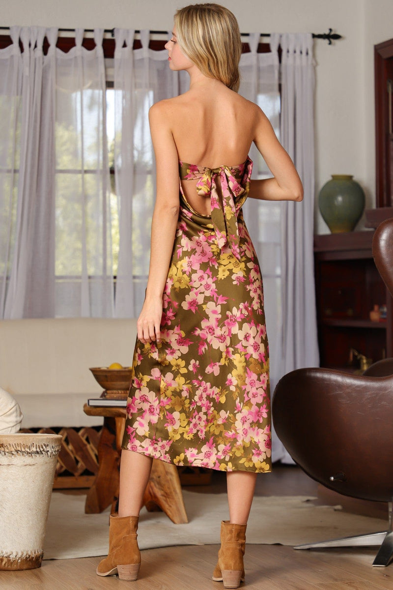 Fabric: Floral Printed Sheen Satin Material. Strapless. Cowl back with Fabric Tie. Midi Length. Fully Lined.