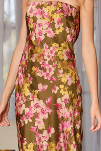 Make an entrance in the stunning Sophia Midi Dress by Le Rêveur! This silky strapless number is decorated with a elegant floral print in pink and yellow hues onto a stunning olive green background. The details of this cut are endless, featuring a strapless style top with fabric tie around and draping cowl back. Finish the look with your favorite accessories and a boot or heel.
