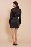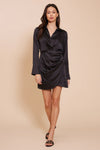 The Tristan Wrap Dress by Lucy Paris is a fantastic addition to your holiday wardrobe. Sheen black satin material shapes a flattering gathered waist, accented by a elegant collared neckline and mini length. Take your little black dress collection to the next level with this dress!